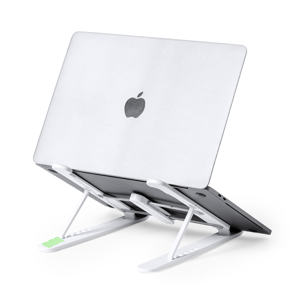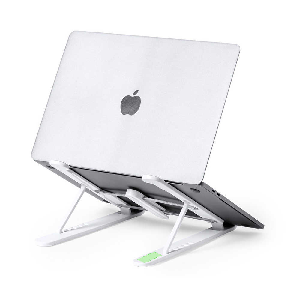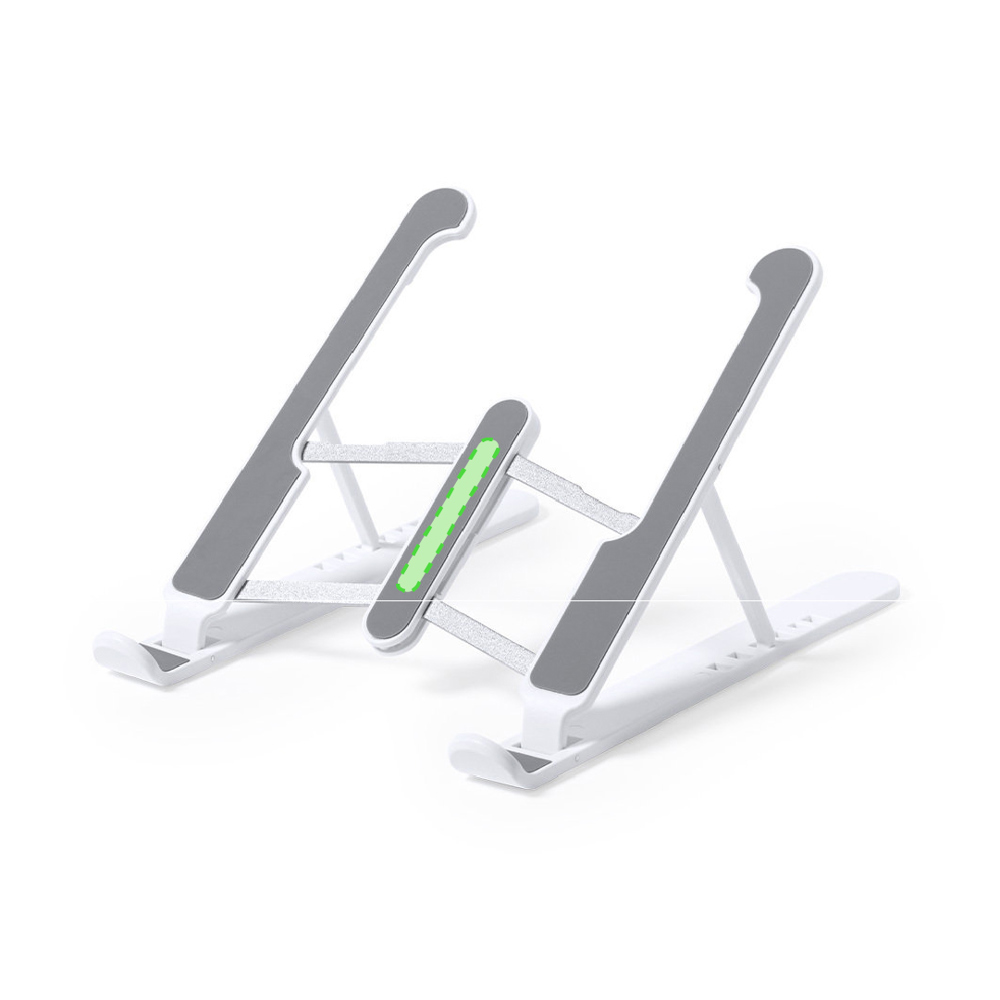 Zusammenklappbarer Laptop-Ständer. Hergestellt aus strapazierfähigem ABS mit rutschfestem TPR-Schutz für einen festen Sitz auf dem Gerät. Höhenverstellbar, kompaktes Faltmaß und präsentiert in einer Wildlederhülle mit Kordelzugverschluss und in einer individuellen Designbox.