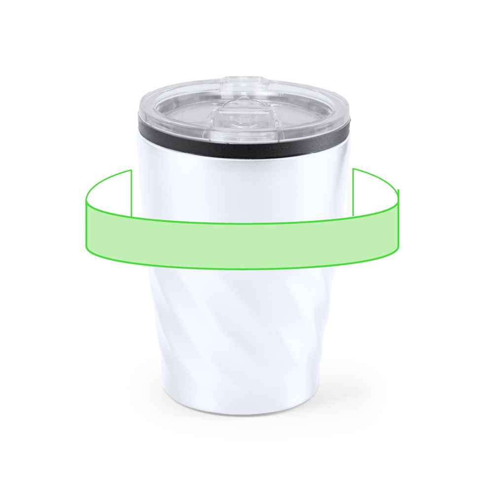 Trinkbecher aus rostfreiem Stahl mit einem Fassungsvermögen von 350 ml. Konisches Design mit schwarzem Ring. Mit origineller transparenter Spenderkappe und Easy-Opener. Es ist ideal für Ihren Schreibtisch, Tisch oder jede andere Oberfläche, auf der Sie in Ruhe Ihr Lieblingsgetränk genießen können.