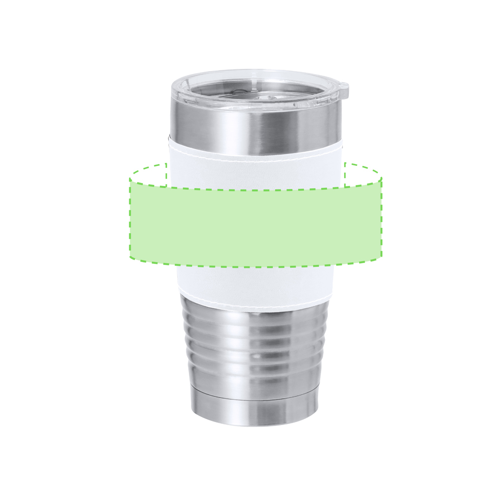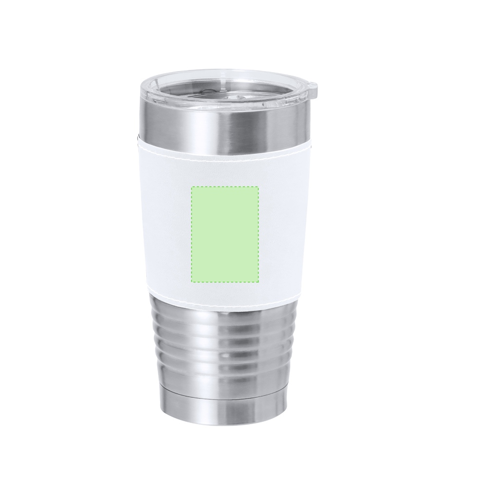 Isolierbecher aus doppelwandigem Edelstahl und hochwertigem PU. Mit einer Kapazität von 420 ml. Inklusive einer eleganten PU-Hülle mit markanter weißer Naht. Es ist ideal für Ihren Schreibtisch, Tisch oder jede andere Oberfläche, auf der Sie in Ruhe Ihr Lieblingsgetränk genießen können. Mit transparentem Deckel mit Spender, leicht zu öffnen und BPA-frei.